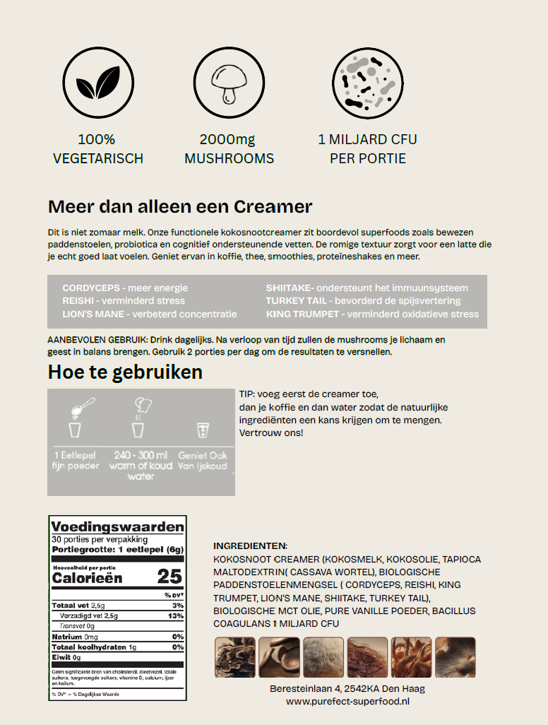 Onze Premium Mushroom Creamer is dé gezonde upgrade voor je koffie, thee of smoothie! Met 2000 mg adaptogene paddenstoelen en probiotica per portie ondersteunt deze romige kokosnootcreamer jouw energie, focus, spijsvertering en immuunsysteem. Geniet dagelijks van een zachte latte-ervaring die je lichaam én geest in balans brengt.